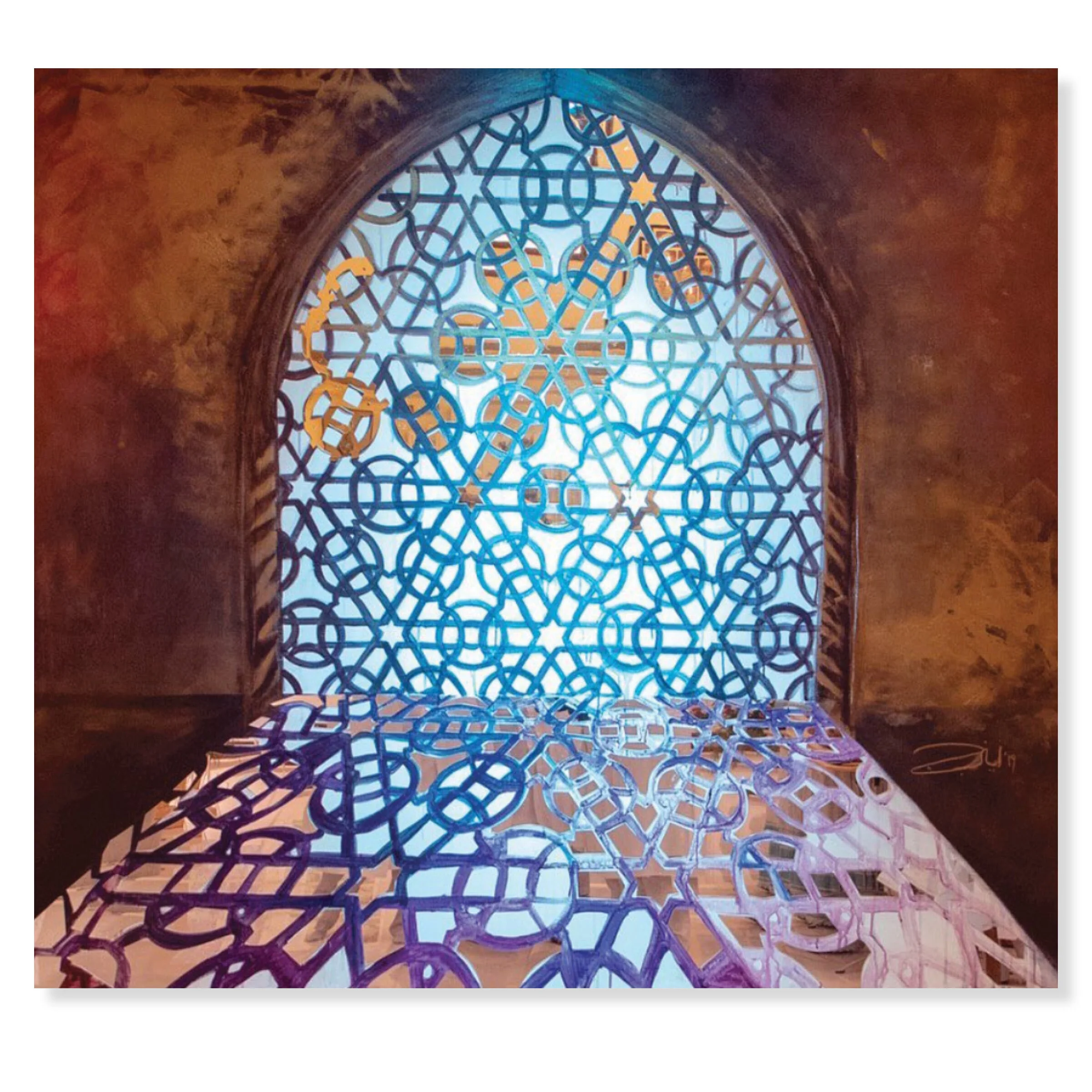 ‘Sacred Reflections’ is a painting inspired by a geometrically patterned Fatimi grill that is replicated in Aljamea-tus-Saifiyah’s Nairobi campus.