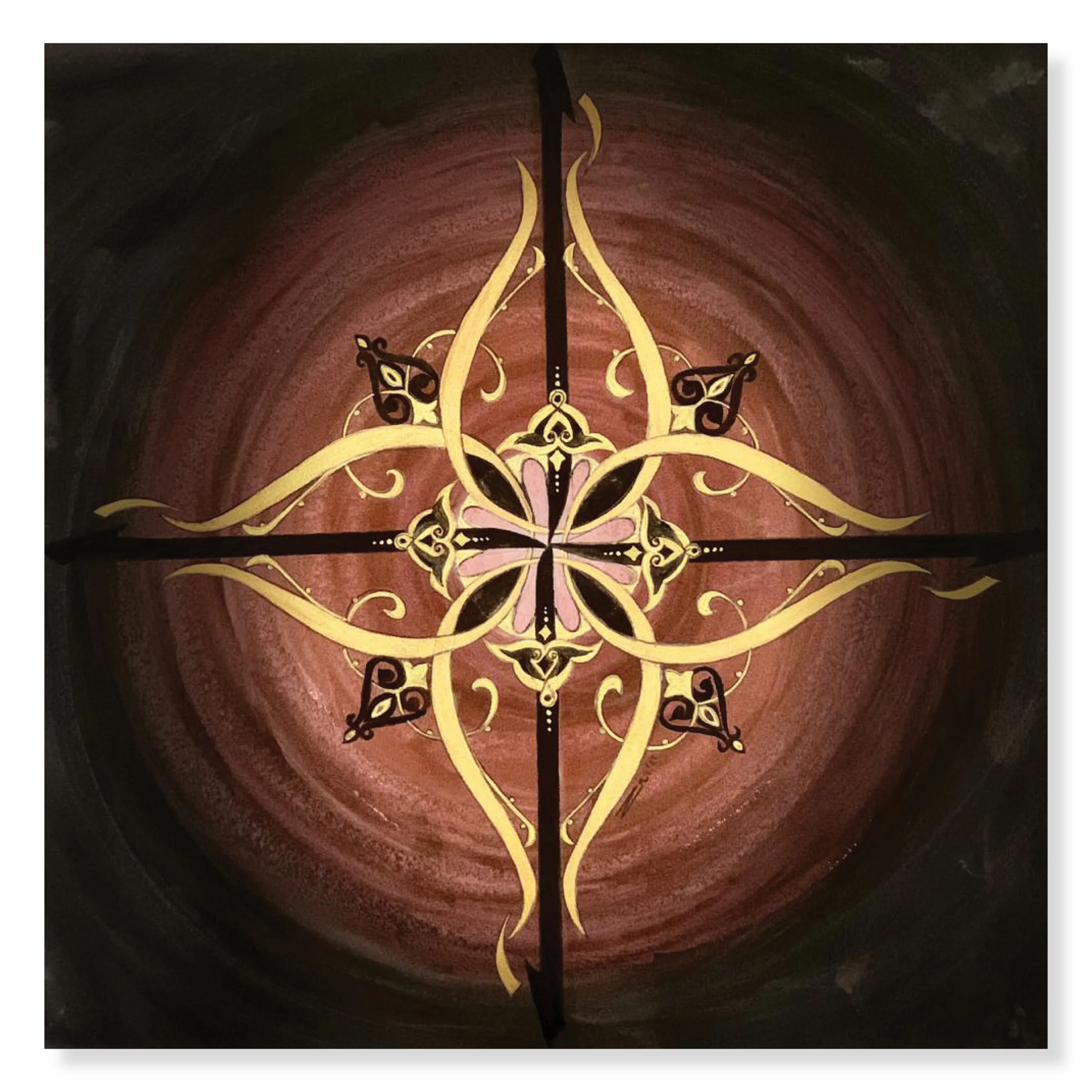Imam Ahmad al-Mastur SA , explaining the murabba’aat or fourfold orders states that most natural groupings have been established by Allah TA in fours. Within this painting, ‘Ā𝘢𝘩𝘪𝘯’ is repeated four times in Arabic from the epicentre of a circle signifying the cosmos, to form a four-fold pattern resulting in a ‘circularity over squareness of four foldness’. The number four signifies the material dimension and the unfolding of matter. The four Alifs placed in four directions signify that all fourfold orders lament the tragedy of Karbala and it is through this grief that one is able to transcend the material dimension into a state of higher consciousness that is beyond the fourness of dimension.